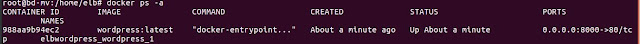El resultado puede comprobarse empleando, como administrador, el comando docker ps -a, y se puede confirmar desde el navegador de red si se acude a la dirección "http://localhost:8000" (donde podrá verse el inicio de la instalación del WordPress).